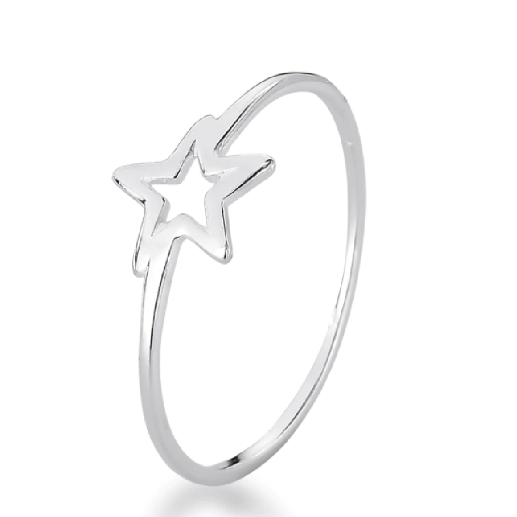 Anel Estrela Lisa Vazado, composto de prata lisa em forma de um anel com uma estrela vazia lateral;