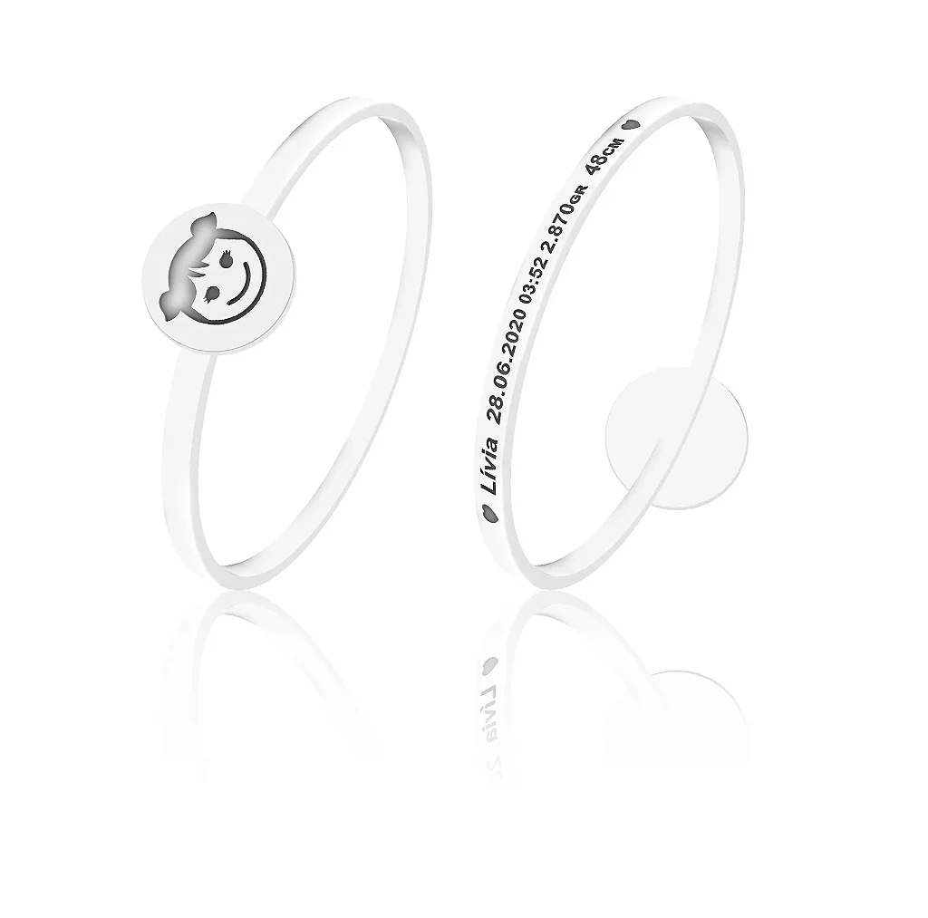 É possível personalizar o Anel Personalizado com Dados de Nascimento e Topo Redondo com Nome em Prata com o nome, a data, o horário, o peso e os centímetros de nascimento do bebê. Os textos personalizados ficam entre dois corações igual à foto.