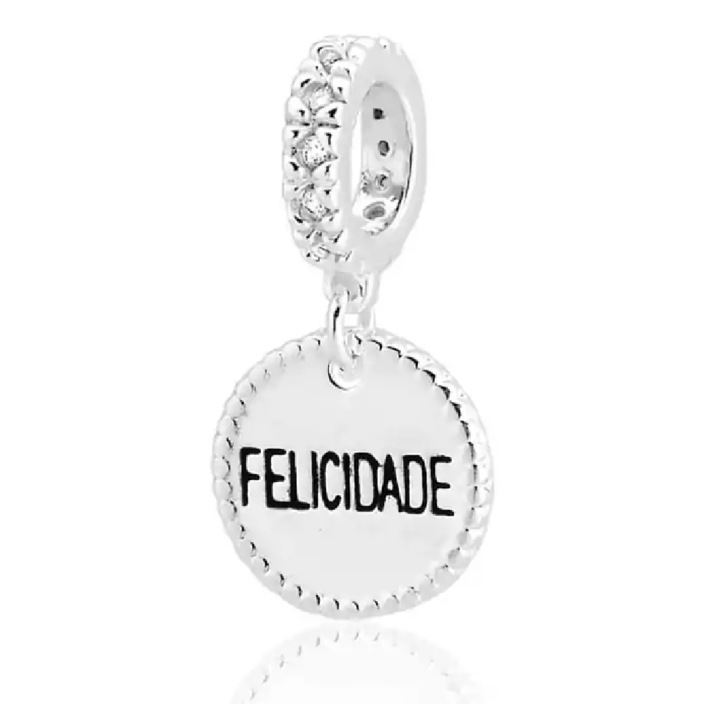 Berloque Medalha Felicidade de Prata, este berloque é composto por uma medalha de prata com o palavra "Felicidade"