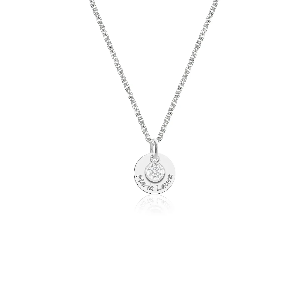 Colar feminino com Cristal Branco e Medalha personalizavel - PRATA 925