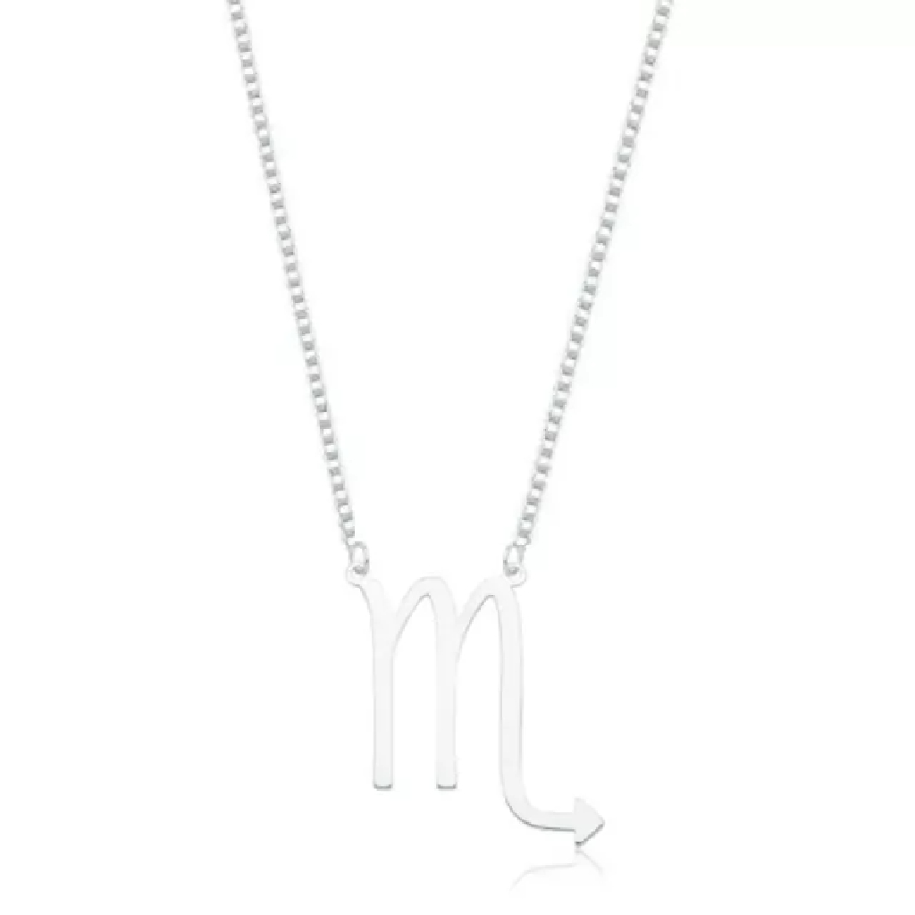 Gargantilha Signo Escorpião de Prata 925, esse produto usa corrente de prata veneziana, vem com Pingente Signo Escorpião, que é composto por prata lisa em forma de signo Escorpião;