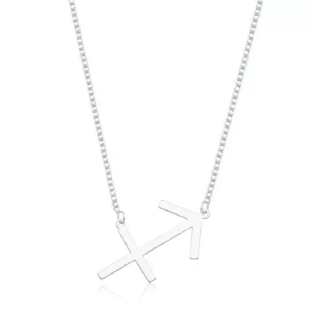 Colar Signo Sagitário de Prata 925, esse produto usa corrente de prata veneziana, vem com Pingente Signo Sagitário, que é composto por prata lisa em forma de signo Sagitário;