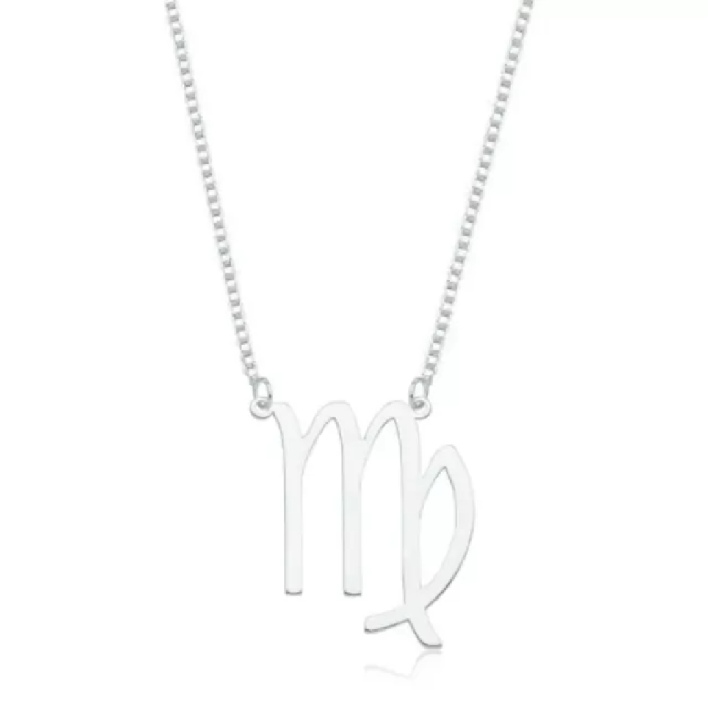 Colar Signo Virgem de Prata 925, esse produto usa corrente de prata veneziana, vem com Pingente Signo Virgem, que é composto por prata lisa em forma de signo Virgem;