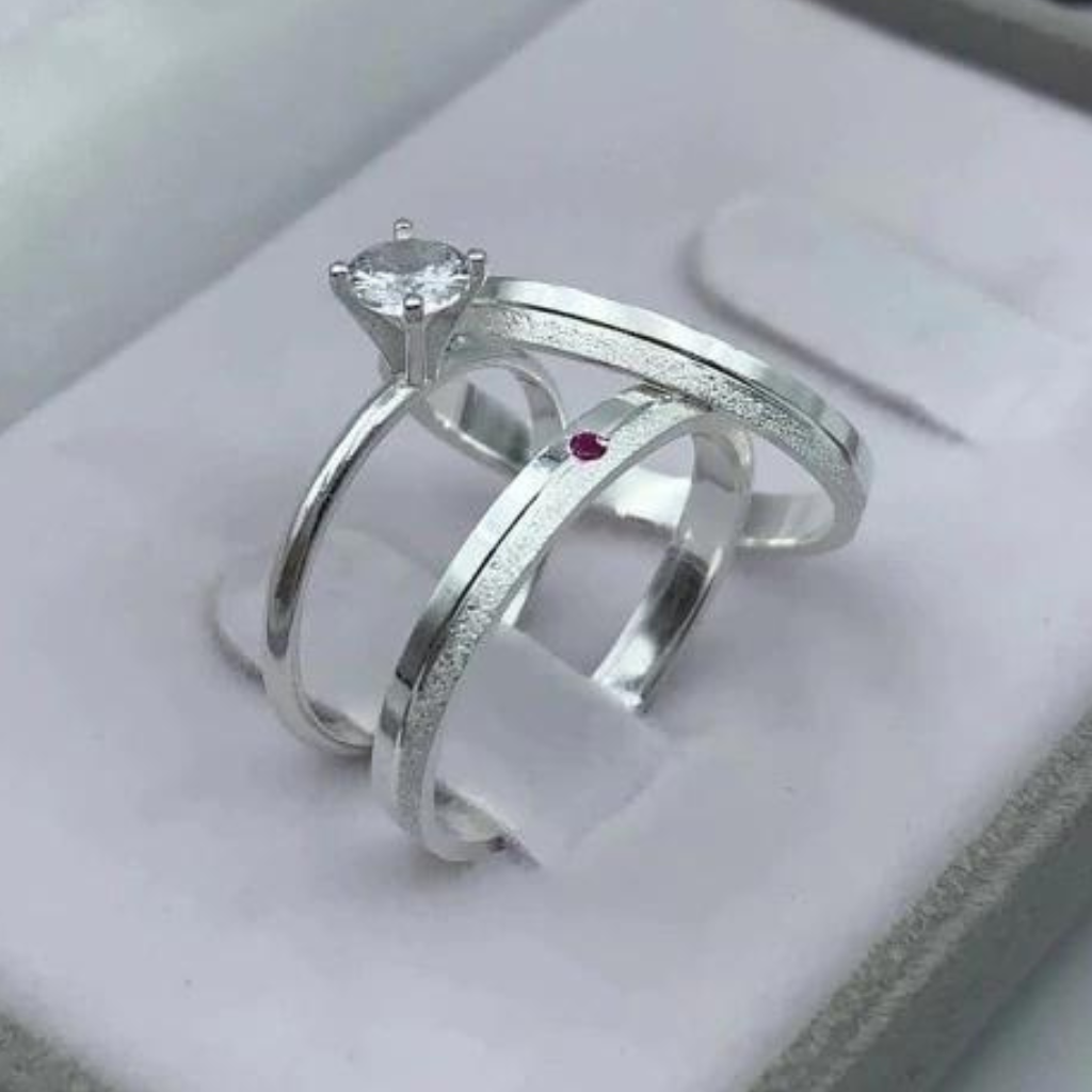 Par de Alianças Namoro Pedra Vermelha Prata 950 Cinderela 2mm