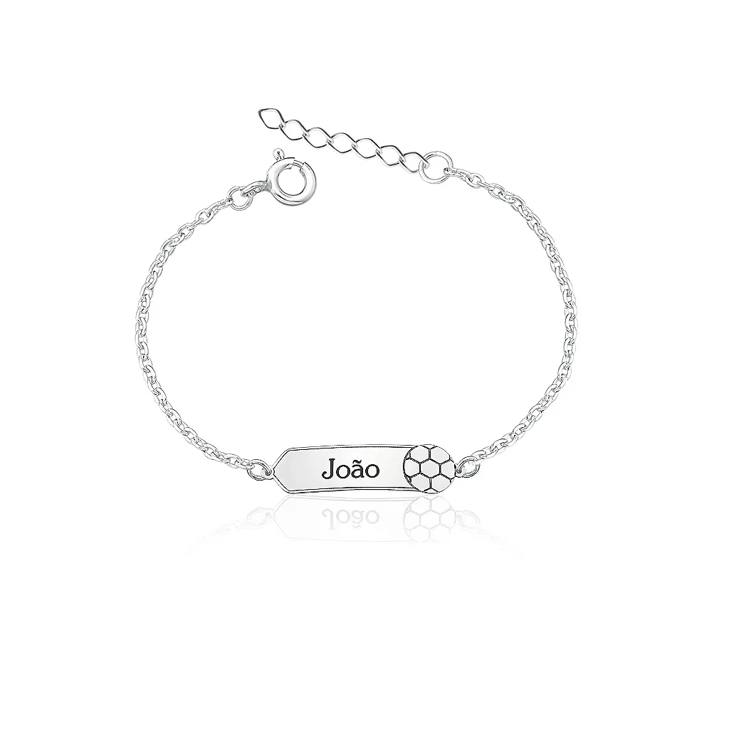 Se apaixone pela pulseira infantil de placa personalizada com o desenho de uma bola lateral. Escreva o nome no campo.