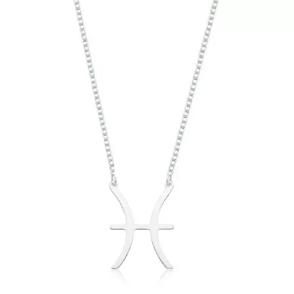 Colar Signo Peixes de Prata 925, esse produto usa corrente de prata veneziana, vem com Pingente Signo Peixes, que é composto por prata lisa em forma de signo Peixes;